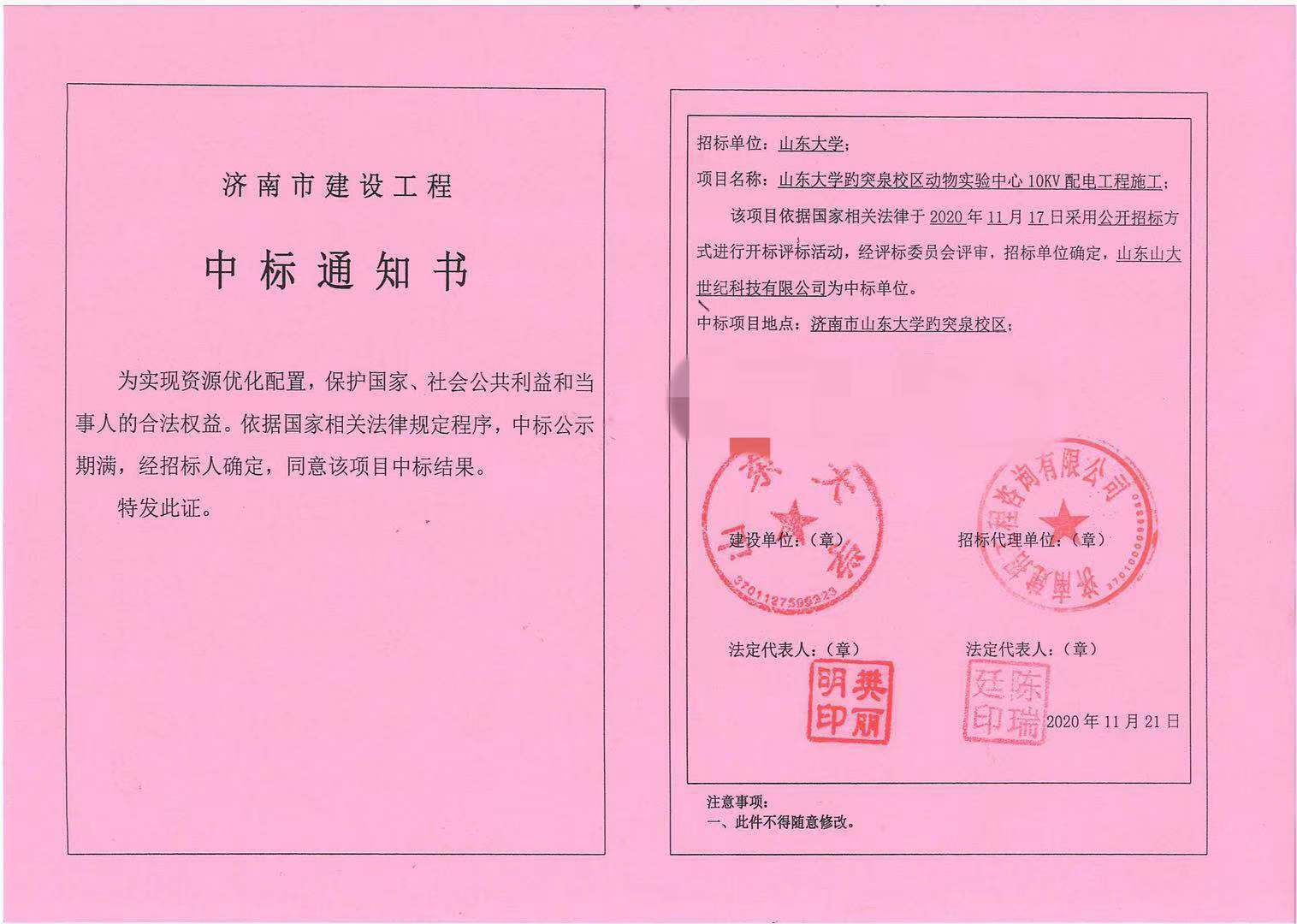 熱烈祝賀山大世紀公司中標“山東大學趵突泉校區(qū)動物實驗中心10KV配電工程施工項目”